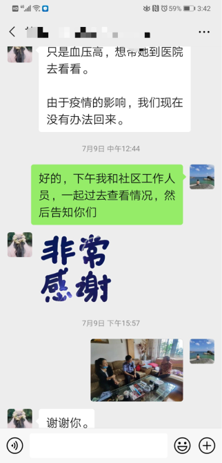 7月9日中午,朱雪峰正在吃午餐,突然收到了楊阿姨女兒的一條微信,“想求求你,可不可以幫助我們,最近我母親血壓不太穩(wěn)定,現(xiàn)在血壓很高,在家躺著,想請(qǐng)你帶她去醫(yī)院看看,我們很著急……”