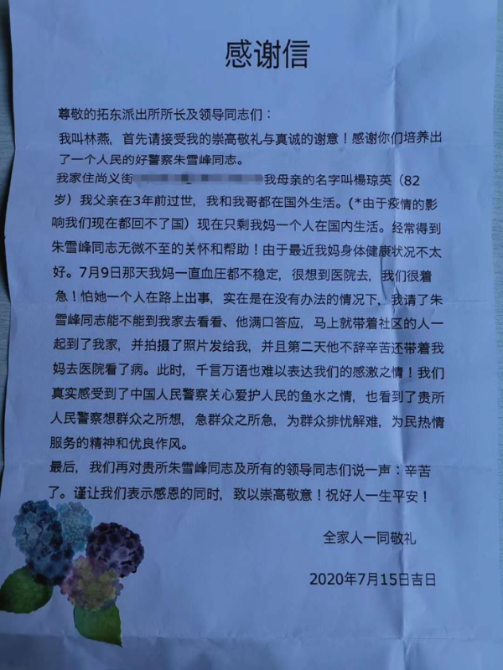 “你們幸苦了!祝好人一生平安!”7月30日,派出所突然接到一封日本的來信,打開一看,竟是楊阿姨遠(yuǎn)在日本的女兒寄來的感謝信,信中楊阿姨女兒真誠地寫道:“我們真實(shí)地感受到了中國人民警察關(guān)心愛護(hù)人民的魚水之情,也看到了貴所人民警察想群眾之所想,急群眾之所急,為民排憂解難,為民熱情服務(wù)的精神和優(yōu)良作風(fēng)……”