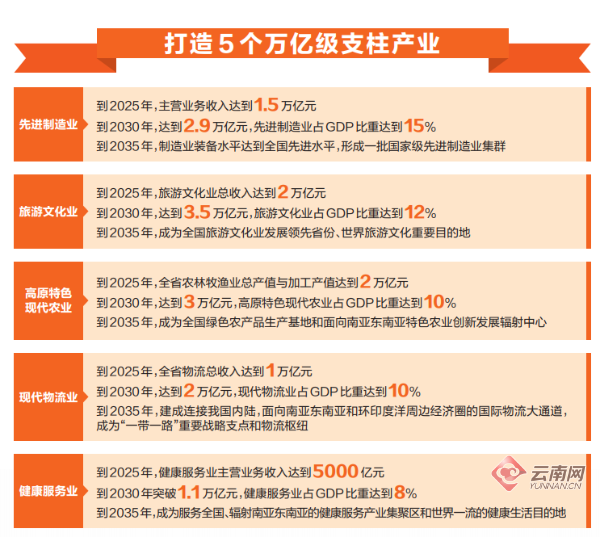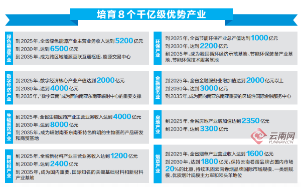 《決定》突出八大重點產(chǎn)業(yè)、世界一流“三張牌”在現(xiàn)代化產(chǎn)業(yè)體系中的引領(lǐng)帶動作用,提出了打造先進制造業(yè)、旅游文化業(yè)、高原特色現(xiàn)代農(nóng)業(yè)、現(xiàn)代物流業(yè)、健康服務(wù)業(yè)5個萬億級支柱產(chǎn)業(yè)和綠色能源、數(shù)字經(jīng)濟、生物醫(yī)藥、新材料、環(huán)保、金融服務(wù)、房地產(chǎn)、煙草8個千億級優(yōu)勢產(chǎn)業(yè)的目標。