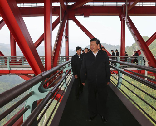 2013年11月3日至5日,中共中央總書記、國家主席、中央軍委主席習近平在湖南考察。這是3日下午,習近平來到位于湖南吉首市的矮寨特大懸索橋考察。新華社記者 蘭紅光攝