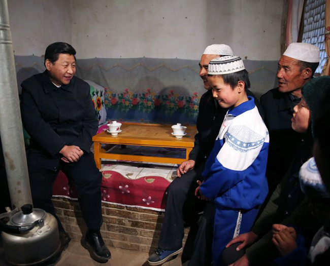 2013年2月3日,習(xí)近平沿著陡峭山路來到山大溝深的臨夏回族自治州東鄉(xiāng)族自治縣布楞溝村看望東鄉(xiāng)族群眾。圖為習(xí)近平在村民馬麥志家,和一家人聊家常。新華社記者 蘭紅光 攝