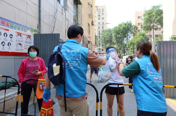 北京新發(fā)地市場發(fā)生聚集性疫情后,玉泉東市場周邊20個(gè)小區(qū)實(shí)施應(yīng)急封閉管理,社區(qū)居民生活面臨諸多困難。海淀區(qū)新時(shí)代文明實(shí)踐中心第一時(shí)間招募志愿者來為居民服務(wù)。