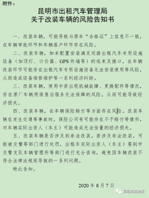 昆明信息港訊(昆明日報 全媒體記者吳勁松) 昆明市交通運(yùn)輸局發(fā)布《關(guān)于再次重申禁止“指定4S店購車”等行為的通知》(以下簡稱《通知》)以及《昆明市出租汽車管理局關(guān)于改裝車輛的風(fēng)險告知書》,再次重申禁止巡游出租汽車經(jīng)營企業(yè)(下稱經(jīng)營企業(yè))要求車主向指定4S店購車。