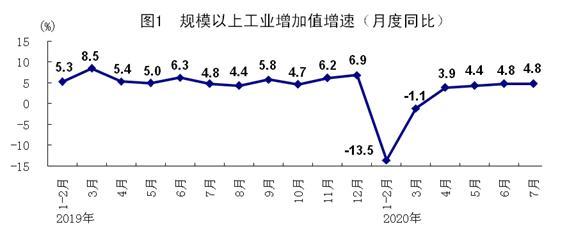 7月份,全國(guó)規(guī)模以上工業(yè)增加值同比增長(zhǎng)4.8%,增速與6月份持平;環(huán)比增長(zhǎng)0.98%。1-7月份,全國(guó)規(guī)模以上工業(yè)增加值同比下降0.4%,降幅比1-6月份收窄0.9個(gè)百分點(diǎn)。