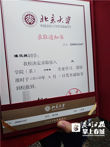 “沒想到我會被北京大學(xué)錄取,拿到通知書還是很激動。”潘靈捷告訴記者,她畢業(yè)于云南師范大學(xué)附中,今年高考總分709分,位列全省理科第59名,被北京大學(xué)工學(xué)院(系)力學(xué)類專業(yè)錄取。談到成績時,潘靈捷說,她雖被北京大學(xué)錄取,但還是有一點點遺憾,要是再多考幾分,她就可以選擇北京大學(xué)更好的專業(yè)。