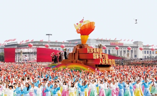 2019年10月1日,慶祝中華人民共和國成立70周年大會在北京天安門廣場隆重舉行。這是群眾游行中的“凝心鑄魂”方陣。 新華社記者 李欣/攝