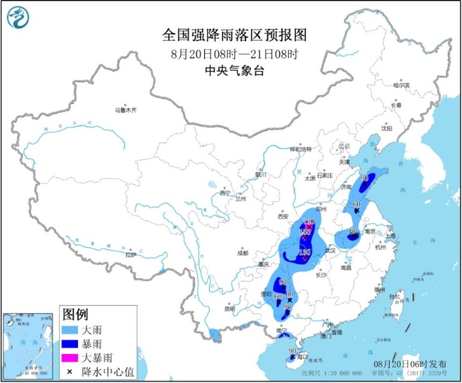 預(yù)計,8月20日08時至21日08時,廣西中北部、海南島、云南南部、貴州中東部、重慶東部、湖南西部和北部、湖北、河南南部、安徽中北部、江蘇北部、山東東部和南部等地的部分地區(qū)有大到暴雨,其中,湖南北部、湖北北部、河南西南部等地局地有大暴雨(100~150毫米)。上述部分地區(qū)伴有短時強(qiáng)降水(最大小時降雨量20~50毫米,局地可超過60毫米),局地有雷暴大風(fēng)等強(qiáng)對流天氣。