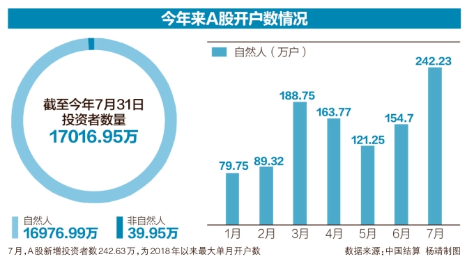 8月19日下午,中國(guó)結(jié)算公布的數(shù)據(jù)顯示,7月,A股新增投資者數(shù)242.63萬(wàn)戶,較6月份的154.90萬(wàn)戶增長(zhǎng)56.6%。這也創(chuàng)下了2018年以來的最大單月開戶數(shù),且A股投資者首次突破1.7億大關(guān)。證金公司稍早前公布的數(shù)據(jù)顯示,7月新開立融資融券賬戶16.56萬(wàn)戶,較6月的8.55萬(wàn)戶更是大增近一倍,且創(chuàng)下了2015年7月以來的新高。