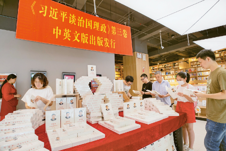 《習近平談治國理政》第三卷的出版發(fā)行,是全黨政治生活中的一件大事,對于推動廣大干部群眾學懂弄通做實習近平新時代中國特色社會主義思想、幫助國際社會更好了解這一重要思想的主要內(nèi)容,具有重要意義。圖為2020年7月3日,浙江省瑞安市新華書城,市民在《習近平談治國理政》第三卷中英文版專柜前專心閱讀。中新社發(fā) 孫凜/攝