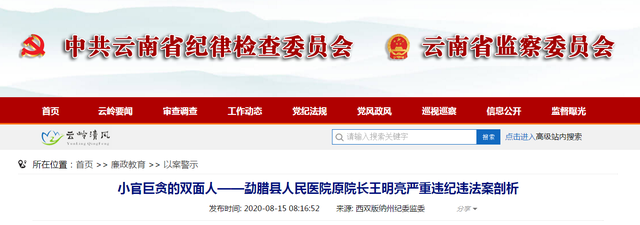 近日,春城晚報-開屏新聞記者從云南省紀(jì)委監(jiān)委網(wǎng)站獲悉,該網(wǎng)站以《小官巨貪的雙面人——勐臘縣人民醫(yī)院原院長王明亮嚴(yán)重違紀(jì)違法案剖析》為題,詳敘了這名34歲便當(dāng)上縣醫(yī)院院長的當(dāng)?shù)孛t(yī),是如何一步步墮落的。