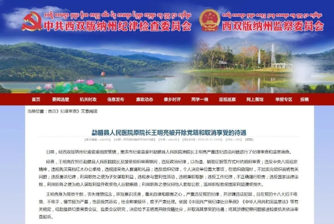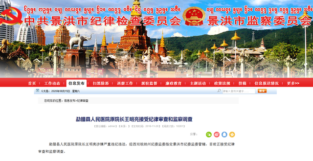 2018年11月,景洪市紀(jì)委監(jiān)委網(wǎng)站發(fā)布消息:勐臘縣人民醫(yī)院原院長王明亮涉嫌嚴(yán)重違紀(jì)違法,經(jīng)西雙版納州紀(jì)委監(jiān)委指定景洪市紀(jì)委監(jiān)委管轄,目前正接受紀(jì)律審查和監(jiān)察調(diào)查。