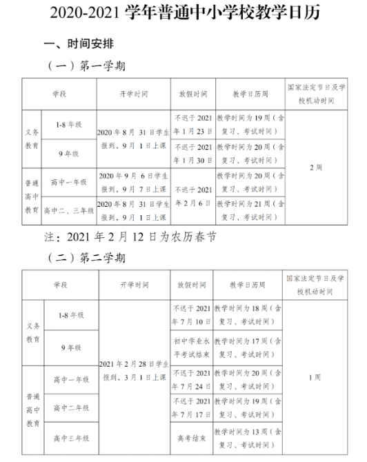 第一學(xué)期于2020年8月31日報到,9月1日上課;寒假時間不遲于2021年1月30日;