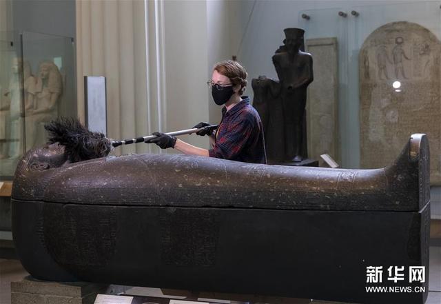 8月25日,一名工作人員在英國倫敦的大英博物館舉行的媒體預展上將展品上的灰塵撣掉,為博物館重新開放做準備。新華社記者 韓巖 攝