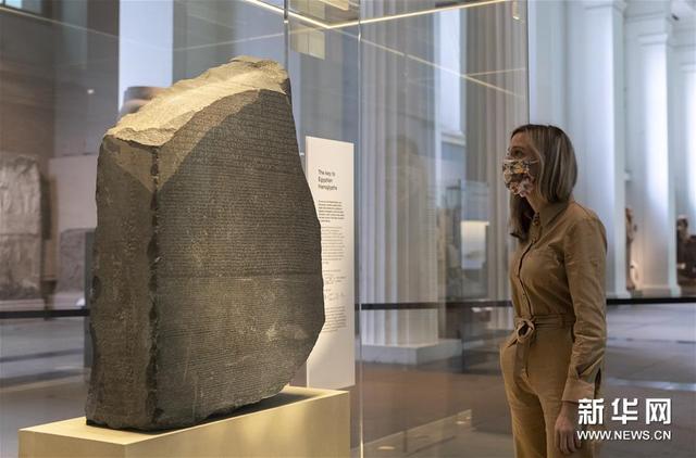 8月25日,一名工作人員在英國倫敦的大英博物館舉行的媒體預展上觀看羅塞塔石碑。新華社記者韓巖 攝