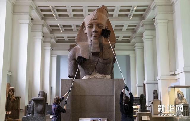 8月25日,工作人員在英國倫敦的大英博物館舉行的媒體預展上將展品上的灰塵撣掉,為博物館重新開放做準備。新華社 記者韓巖 攝