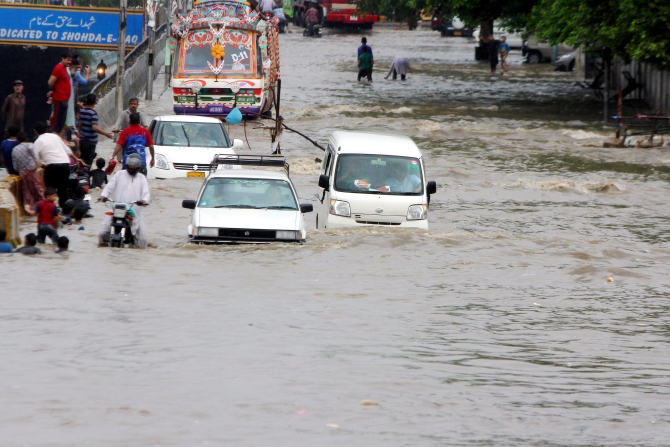 8月25日,在巴基斯坦卡拉奇,汽車在洪水覆蓋的路上行駛。新華社發(fā)