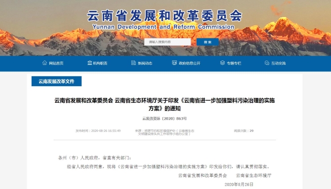 8月26日,云南省發(fā)展和改革委員會(huì)、云南省生態(tài)環(huán)境廳對(duì)外發(fā)布的《云南省進(jìn)一步加強(qiáng)塑料污染治理的實(shí)施方案》顯示,從今年起至2025年,云南將有序禁止、限制部分塑料制品的生產(chǎn)、銷售和使用,積極推廣替代產(chǎn)品,其中今年率先在昆明市等地禁止或限制塑料制品產(chǎn)售和使用。