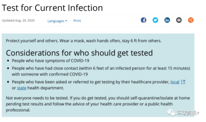在美國(guó)新冠肺炎確診病例每天保持3萬(wàn)例以上高位增長(zhǎng)的當(dāng)下,美國(guó)疾控中心(CDC)近日在官網(wǎng)發(fā)布了應(yīng)對(duì)新冠肺炎疫情的最新指導(dǎo)建議,指出即使與新冠病毒感染者有密切接觸,但是只要沒(méi)有出現(xiàn)相關(guān)癥狀的人,不再必須接受檢測(cè)。該建議還指出,只有屬于易感染人群或者醫(yī)生、所在州或地方官員建議檢測(cè)的才需做檢測(cè)。