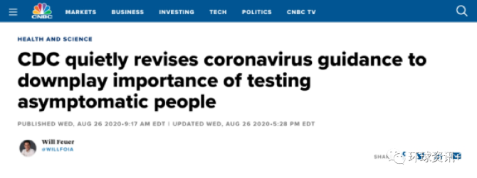 △美國(guó)消費(fèi)者新聞與商業(yè)頻道(CNBC)報(bào)道,美國(guó)CDC悄然更改防疫指南,以淡化對(duì)新冠肺炎無(wú)癥狀感染者進(jìn)行病毒檢測(cè)的重要性
