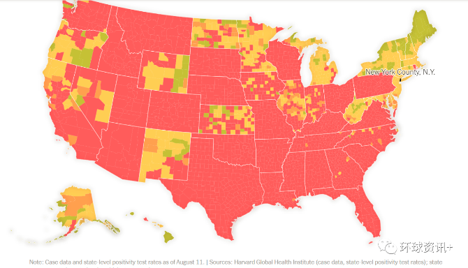 △紅色區(qū)域均為不適合開(kāi)學(xué)的地區(qū),圖自《紐約時(shí)報(bào)》