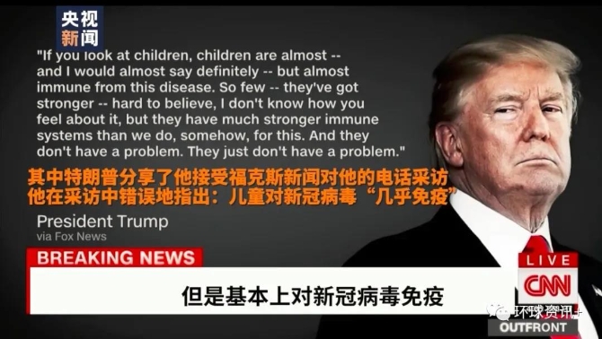 此前,特朗普還在社交平臺(tái)發(fā)布視頻稱,兒童對(duì)新冠病毒“幾乎免疫”。但臉書(shū)和推特先后刪除了相關(guān)視頻,并稱特朗普的這種說(shuō)法違反了禁止發(fā)表有關(guān)新冠肺炎的有害錯(cuò)誤信息的規(guī)定。