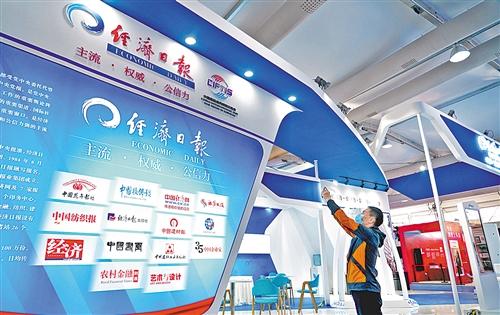 在展位最前端,是簡要介紹經(jīng)濟日報報業(yè)集團的燈箱。經(jīng)濟日報是經(jīng)濟領(lǐng)域發(fā)行量大、權(quán)威性和公信力強的中央主流媒體,擁有經(jīng)濟日報及旗下中國經(jīng)濟網(wǎng)、7家報社、3家雜志社、2家出版社、1個印務(wù)中心,涵蓋了財經(jīng)、證券、金融、紡織、建材、花卉、書畫等多個領(lǐng)域。另一側(cè)的LED大屏滾動播放經(jīng)濟日報和子報子刊的宣傳片。在現(xiàn)場的燈箱上還有二維碼矩陣,觀眾可以掃碼關(guān)注感興趣的報刊新媒體產(chǎn)品。