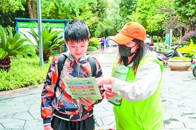 垃圾分類(lèi)互動(dòng)體驗(yàn)中心工作人員在昆明一小區(qū)內(nèi)與一名學(xué)生交流垃圾分類(lèi)知識(shí)。新華社發(fā)