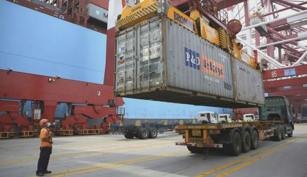 在青島港一處集裝箱碼頭,戴著口罩的工人正指揮龍門吊將集裝箱裝載上卡車。(美聯(lián)社)
