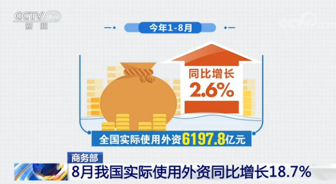 數(shù)據(jù)顯示,今年1到8月,全國實際使用外資6197.8億元,同比增長2.6%。8月當月,全國實際使用外資841.3億元,同比增長18.7%。