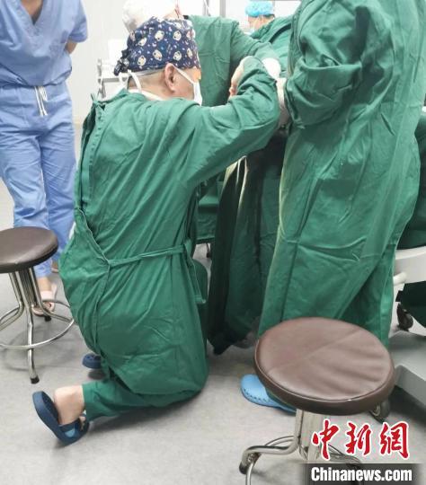 專家會診、制訂手術(shù)方案、術(shù)前檢查……不到一小時,醫(yī)院為患者安排手術(shù)。在手術(shù)過程中,劉國慶跪在地上尋找合適的手術(shù)角度,這一跪就是20多分鐘。劉國慶已年近60歲,跪在地磚上長時間保持不動,這對他的膝蓋和腰是一種挑戰(zhàn)。