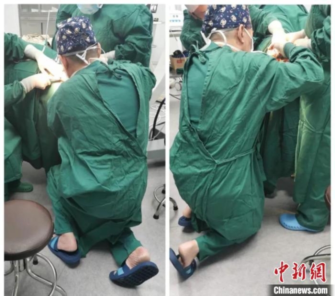在旁輔助手術(shù)的護士深受觸動,用手機記錄下這一幕。這一組跪地手術(shù)照片,記錄的只是一個手術(shù)的姿勢,卻是其從醫(yī)生涯的縮影。劉國慶用“最美跪姿”詮釋了“醫(yī)者仁心”。