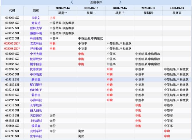 9月14日,直真科技、開普檢測將申購;9月15日,中天火箭、松原股份、銅牛信息申購;9月16日,優(yōu)彩資源、中谷物流、新潔能、廈門銀行、偉時電子、若羽臣、芯??萍忌曩?;9月17日,長華股份、麗人麗妝、天臣醫(yī)療、上緯新材、愛美客申購;9月18日,共創(chuàng)草坪、世華科技申購。