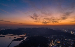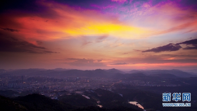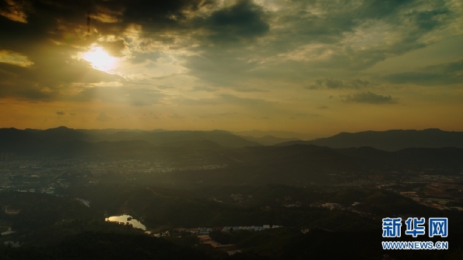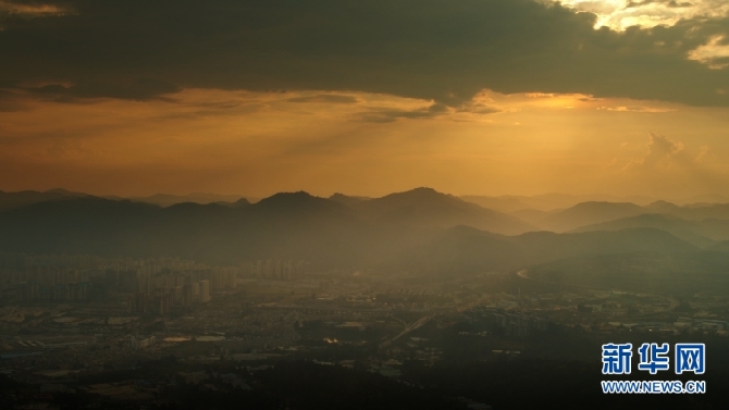 9月3日,夕陽(yáng)下的城市一角與群山。(新華網(wǎng) 劉東 攝)