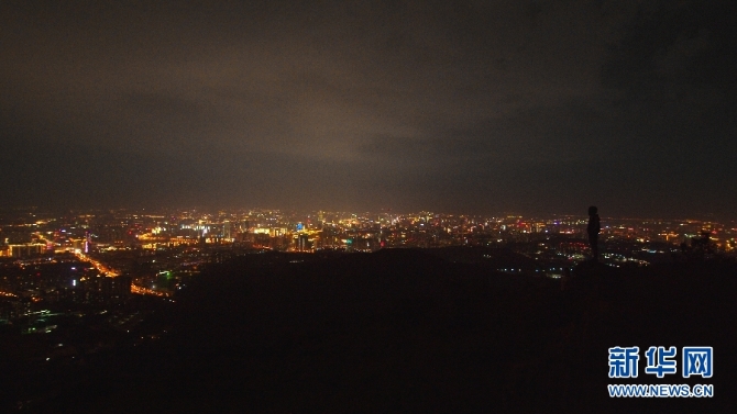 9月3日,站在長(zhǎng)蟲山頂巖石上觀看城市夜景的游客。(新華網(wǎng) 劉東 攝)