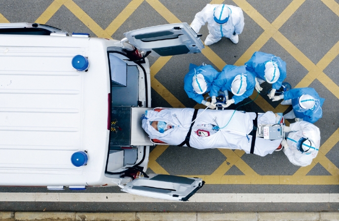 “保護(hù)人民生命安全和身體健康可以不惜一切代價(jià)。”在抗擊新冠肺炎疫情一線,醫(yī)務(wù)工作者盡最大努力搶救每一位患者。圖為2020年3月6日,在華中科技大學(xué)附屬同濟(jì)醫(yī)院,醫(yī)護(hù)人員護(hù)送一名剛做完CT檢查的新冠肺炎重癥患者上負(fù)壓救護(hù)車(無人機(jī)照片)。 新華社記者 才揚(yáng)/攝