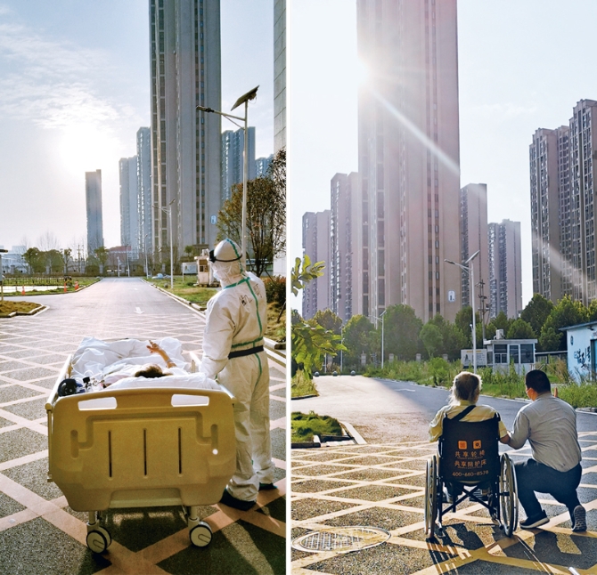 左圖為2020年3月5日,在武漢大學(xué)人民醫(yī)院東院,復(fù)旦大學(xué)附屬中山醫(yī)院援鄂醫(yī)療隊(duì)隊(duì)員、“90后”醫(yī)生劉凱在護(hù)送已住院近一個(gè)月的87歲老人王欣做CT的途中停下來,一起欣賞了一次久違的日落(甘俊超/攝)。右圖為時(shí)隔半年,9月4日,兩個(gè)人在武漢大學(xué)人民醫(yī)院東院重逢,重現(xiàn)攜手看夕陽的溫馨一刻(汪亭玉/攝)。 武漢大學(xué)人民醫(yī)院 杜巍巍供圖