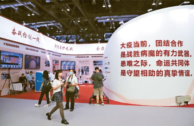 9月4日至9月9日,2020年中國國際服務(wù)貿(mào)易交易會在北京舉行。這是新冠肺炎疫情發(fā)生以來中國在線下舉辦的第一場重大國際經(jīng)貿(mào)活動,共有來自148個(gè)國家和地區(qū)的1.8萬家企業(yè)及機(jī)構(gòu)注冊參展參會。圖為9月5日,觀眾在公共衛(wèi)生防疫專題展區(qū)參觀。 中新社發(fā) 郭海鵬/攝