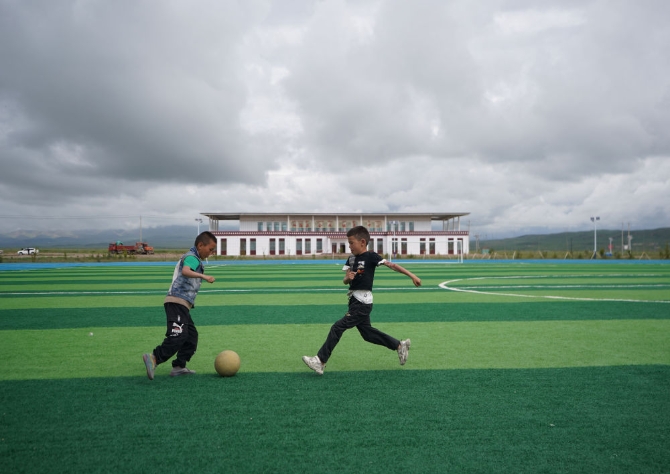 臨近海南藏族自治州興海縣城,一派秀美氣象讓記者途中疲勞盡消:一個坐落在碧綠草原中的村落映入眼簾,一排排色彩鮮亮的藏家民居錯落有致,村中央建有一塊標準足球場,正在踢球的孩子們追逐嬉戲……