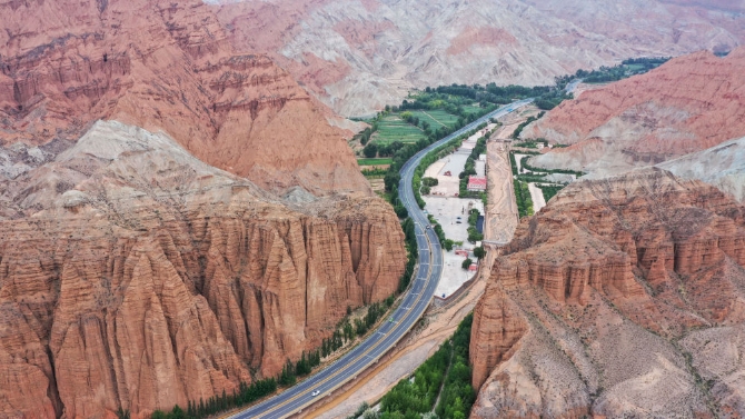 這是6月16日拍攝的位于青海省海南藏族自治州貴德縣境內的丹霞地貌(無人機照片)。新華社記者 吳剛 攝