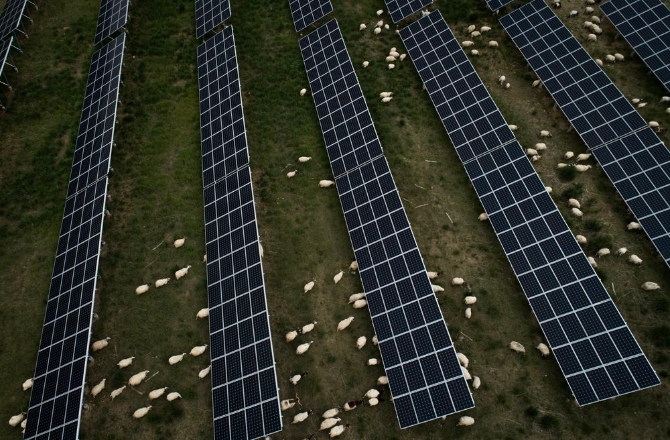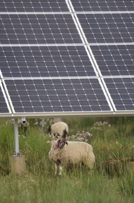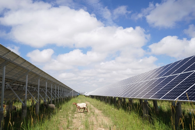羊群在青海省海南藏族自治州光伏發(fā)電園區(qū)內吃草(2019年6月16日攝)。新華社記者 吳剛 攝