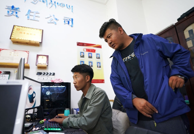 青海阿媽羅羅文化傳播有限責任公司的藏族小伙兒斗本加(右)和同事在給一部文化旅游宣傳片進行后期制作(8月5日攝)。新華社記者 邢廣利 攝