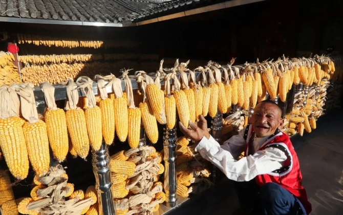 司莫拉佤族村民晾曬玉米。楊崢/攝