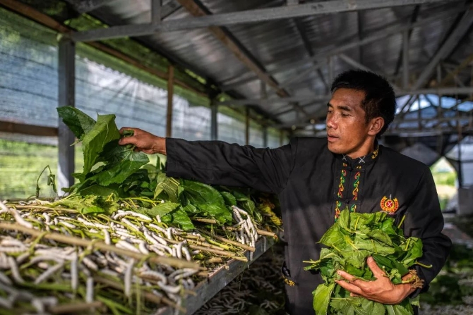 在云南省隴川縣隴把鎮(zhèn)曼崩村,董跑約在蠶棚里給“蠶寶寶”喂桑葉。胡超/攝