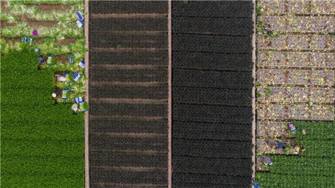 云南省玉溪市通??h秀山街道農(nóng)民在田間勞作(無人機照片)。胡超/攝