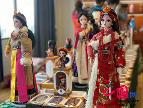 若爾蓋縣白河社區(qū)支部書記、非遺傳承人張慧玲介紹吉祥娃娃。攝影/宋柏霖