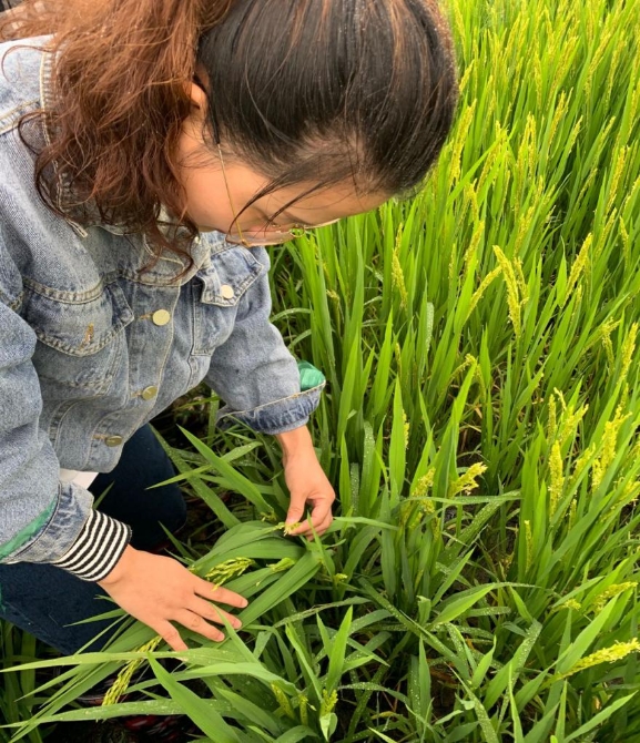 荊州農(nóng)氣試驗站科研人員正在做“寒露風”影響田間調(diào)查 趙小云 攝
