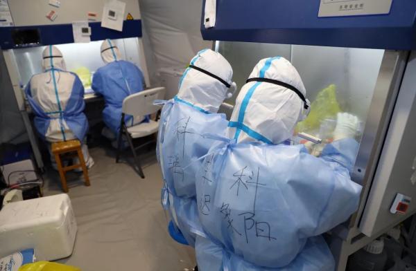 武漢一線,科研人員在帳篷式移動實驗室做實驗 邵龍飛 攝