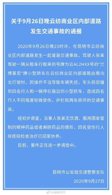 9月27日,記者從昆明交警官方微博獲悉,2020年9月26日晚23時許,在昆明市云紡商業(yè)區(qū)內(nèi)部道路發(fā)生一起道路交通事故。