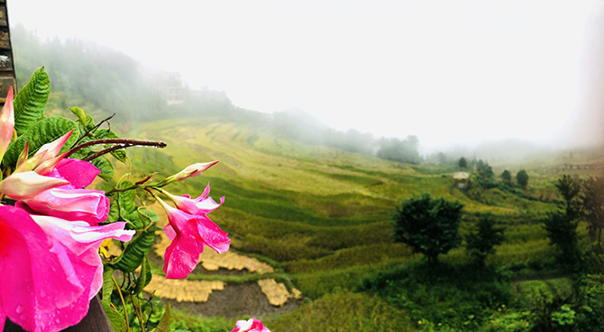 都說(shuō)秋天的梯田金黃如畫,經(jīng)緯縱橫,蔚為壯觀。天公不作美,一場(chǎng)突如其來(lái)的秋雨和大霧與我們開了個(gè)玩笑,遮住了梯田的容顏。