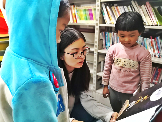 柳文娟和小朋友一起看書(李吒 圖)